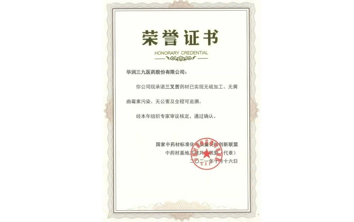 10月16日,在南宁召开的第九届中药材基地共建共享联盟交流大会上,PA视讯官方网站申报的“三叉苦”药材获评“三无一全”优质药材,并颁授品牌品种证书。“三无一全”证书由国家中药材标准化与质量评估创新联盟颁发,要求在中药材生产过程中实现无硫加工、无黄曲霉素污染、无公害及全程可追溯。