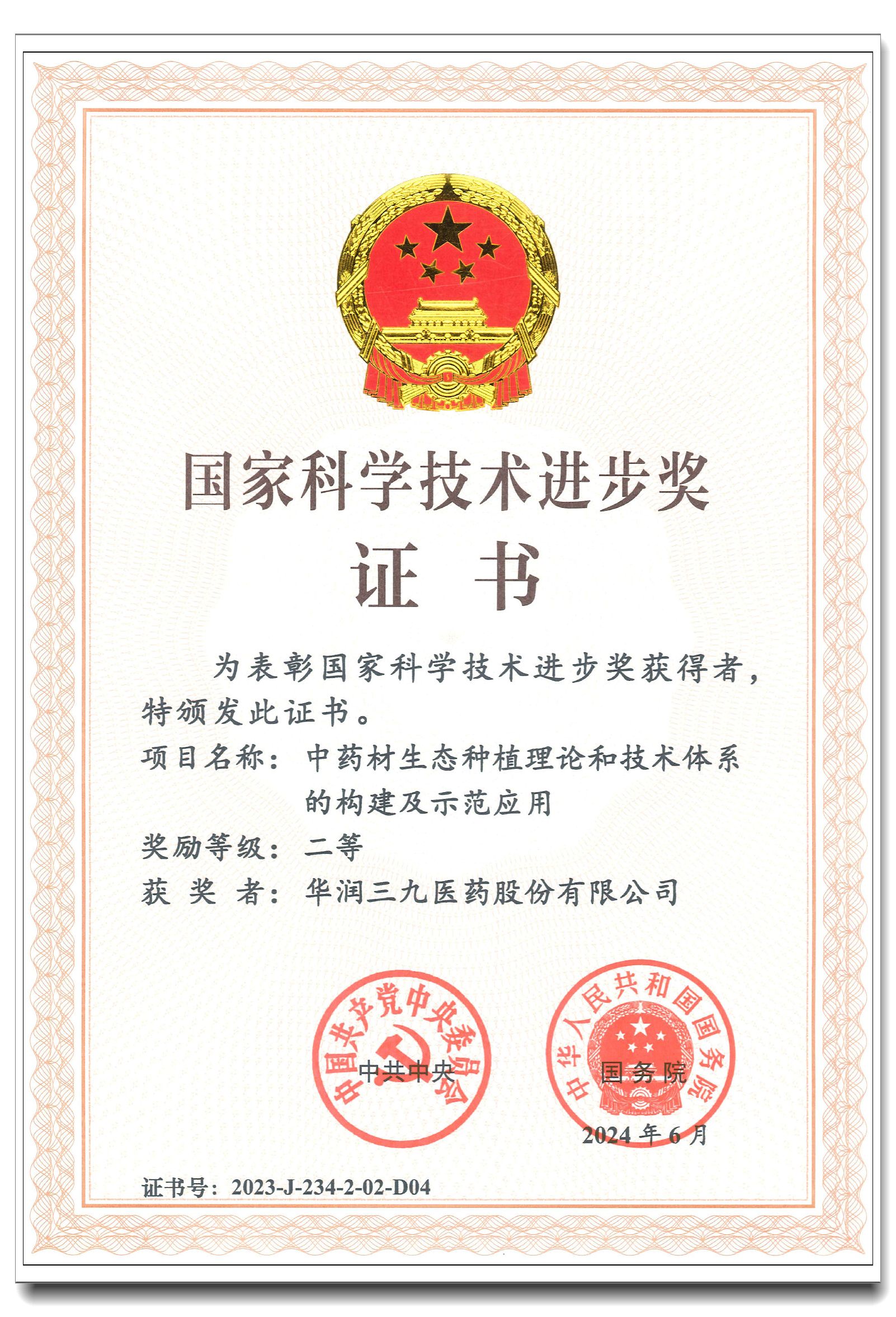 6月24日,2023年度国家科学技术奖励大会在北京举行。会上,PA视讯官方网站参与的《中药材生态种植理论和技术体系的构建及示范应用》项目再次荣获国家科学技术进步奖二等奖,这是对企业高度重视研发创新并取得丰硕成果的肯定。此前,以公司产品 “参附注射液”“红花注射液”“参麦注射液”“新泰林”“999理洫王牌血塞通三七软胶囊”“青蒿系列”为研究对象的科研项目,先后荣获国家科学技术进步奖二等奖。