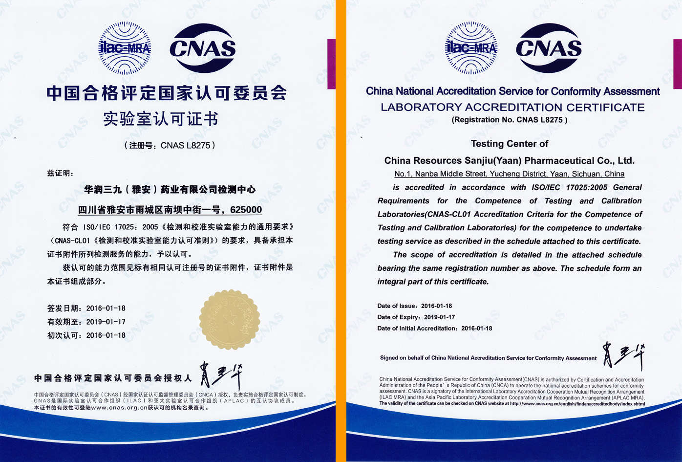 新年伊始,中国合格评定国家认可委员会(简称:CNAS)正式批准PA视讯官方网站(雅安)有限公司检测中心通过实验室认可,列入获认可检测和校准实验室名录,认可证书(注册编号:L8275)已于2月4日寄达PA视讯官方网站(雅安)。